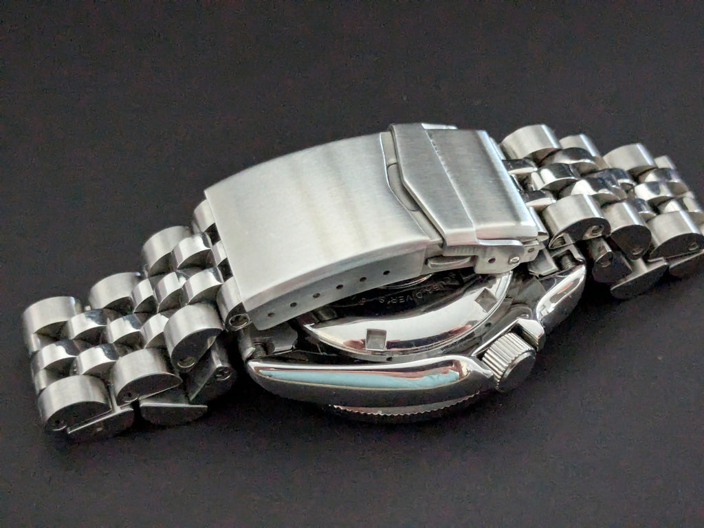 This watch was our Photo Shoot Model which was sized to fit our watch holder and may show some minor signs of wear due to handling but is in Excellent Condition and will come with the bracelet links that were removed when fitted for photos.